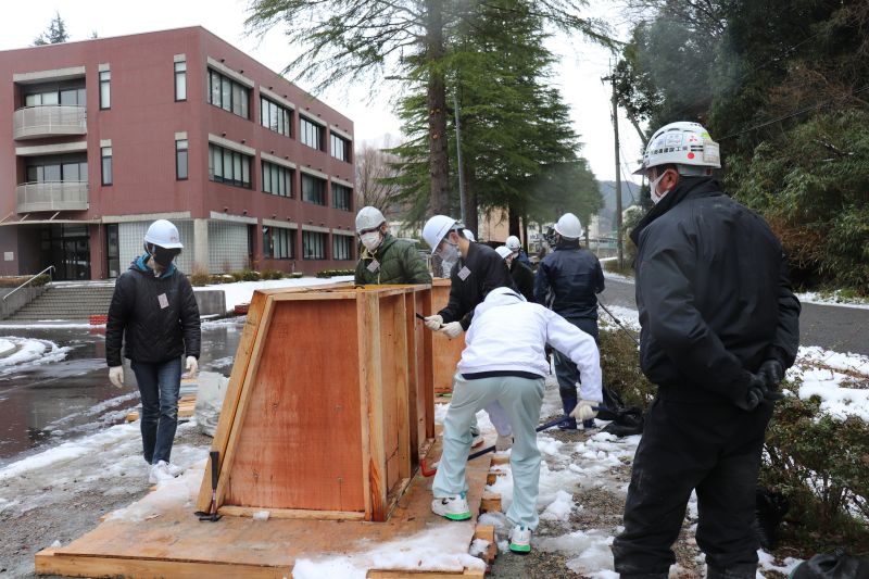 12月19日(日)に,民間企業,学生を対象に,e+iMec講習会【コンクリートの品質管理】を開催しました。この度の講習会は,(株)宝生,舞鶴高専の学生から計7名が受講しました。講習会は,計4日間にわたり行われます。今回は4日目のカリキュラムが実施され,座学の後,コンクリートの脱型実習を行いました。これまでに11月27日,28日に①②墨だし,鉄筋加工,型枠組立実習,12月2日に③生コン受入れ検査,打設,コテ仕上げ・養生実習を行いました。