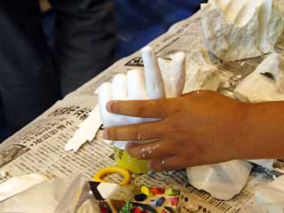 平成25年8月20日(火)に舞鶴市城南会館で同会館主催による夏休み自由研究「石こうで立体コピー」の出前授業を行いました。指導は西山教授と補助学生2名が行いました。モノを作る色々な方法(削る、切る、曲げる、くっ付ける、型に入れて固めるなど)を学習したのち、石こうで手の形をつくる「石こうで立体コピー」に取り組みました。手の型を取る型取り材は液状から徐々に弾力性のある固体に変わっていきます。この間、手を入れた状態で数分間じっと待ち、型取り材がだいたい固まったら、ゆっくりと手を抜いて型の完成です。その型に石こうを流し入れ、1時間ほど待って、型取り材を取り除けば手のコピーの完成です。上手にできた作品は手の形だけでなくしっかりと指紋までコピーできていました。
