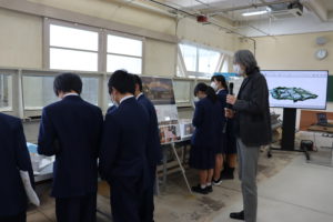 建設システム工学科では、建築模型と橋梁模型、クレインブリッジの破損したローラーを紹介しました。建築模型は、舞鶴市内で実際に改装工事が進んでいるUIJターン者用のお試し住宅です。学生が考えて模型も作成しました。橋梁模型は、兵庫県養父市の天滝遊歩道に架ける橋を学生が設計し提案したもので、5分の1サイズの模型も学生が作成したものです。