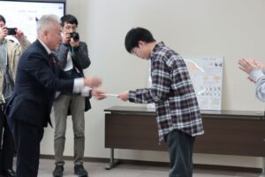 2月7日(水)一般社団法人京都府建築士会会長の山領氏や同舞鶴支部長の坂根氏、他が来校し、受賞した4名の学生と指導教員の尾上亮介教授、今村友里子講師にそれぞれ賞状が授与されました。