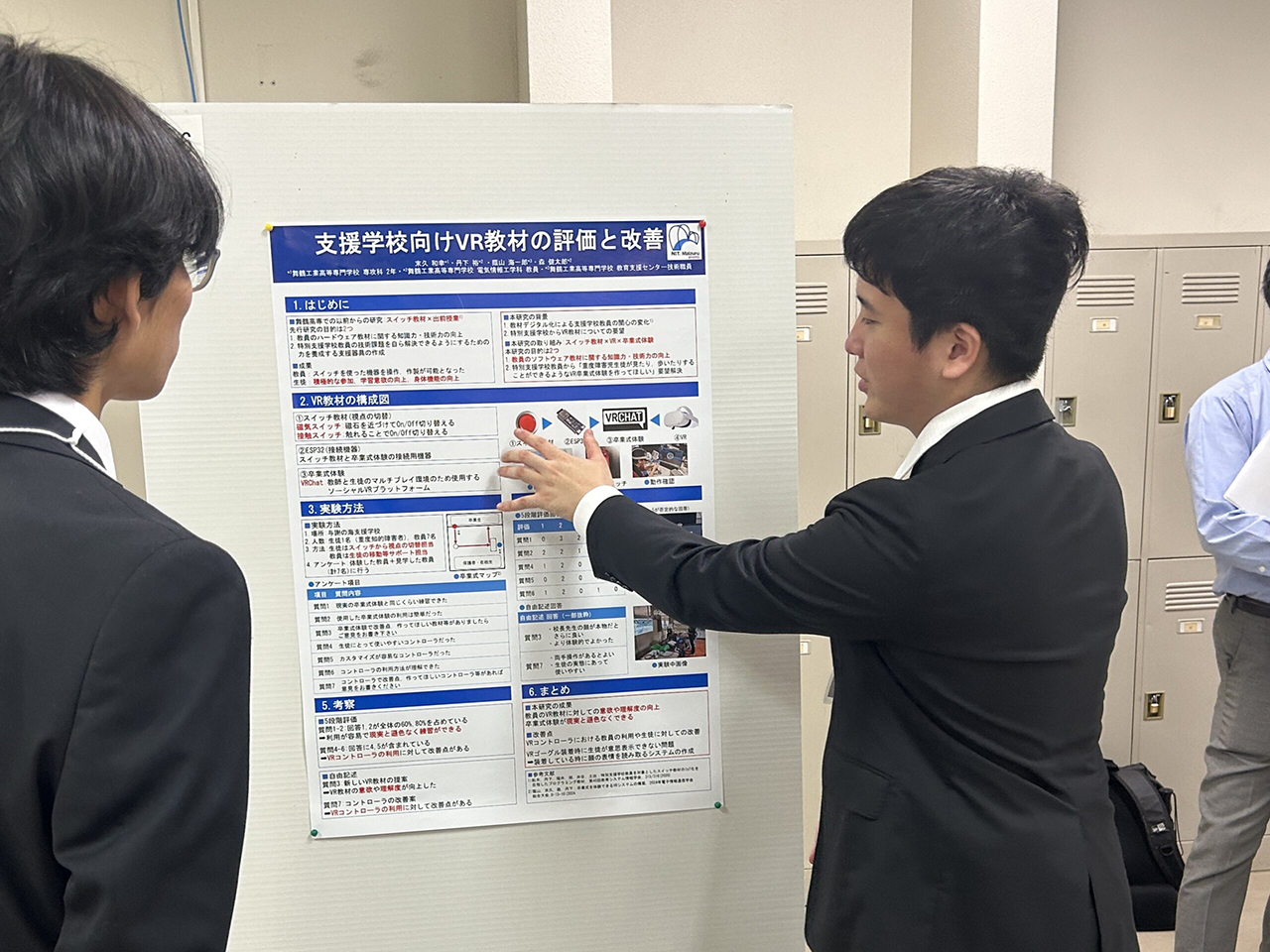 9月24日 2024 学生活動 本校専攻科生が日本高専学会 第30回年会講演会にて学生優秀発表賞を受賞しました。 2024年9月4日~6日に函館高専で開催された、日本高専学会 第30回年会講演会に専攻科電気電子システムコース2年の末久和幸さんが参加し、「支援学校向けVR教材の評価と改善」という題目でポスター発表を行い、学生優秀発表賞を受賞しました。 末久さんはVRを活用した教育教材の研究に取り組んでおり、支援学校での活用に向けたVR教材の取り組みについて発表を行いました。学会では多くの参加者と議論や意見交換を行い、今後の研究の進展につながる非常に有意義な参加となりました。