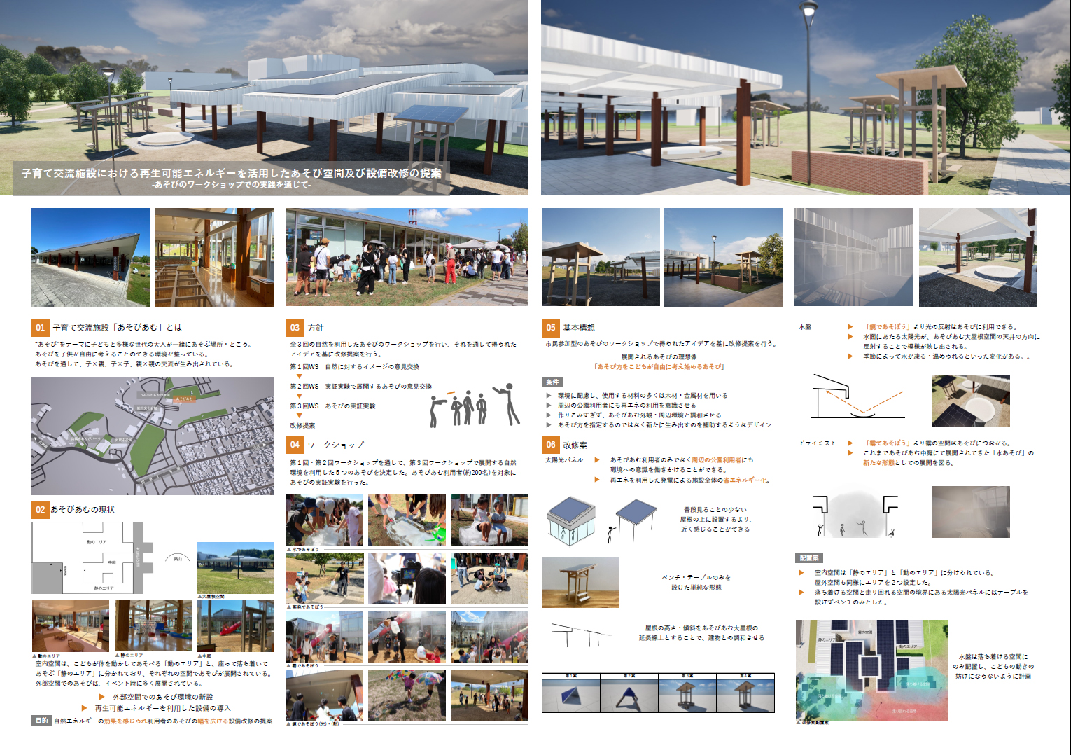 創造的で自由なあそびを通じて子育て支援を進めている「あそびあむ」に新たなあそび場を提案する取り組みです。開設10年を迎えるあそびあむは、地球環境に配慮した再生可能エネルギーを活用する設備更新を行う予定となっています。あそびながら、再生可能エネルギー等の地球環境のことを同時に感じることができる、屋外のあそび場を提案しました。提案は、3回実施した市民とのワークショップの結果から導き出しました。あそびの実証実験には200名を超える参加者があり、研究室の学生たちは外遊びの楽しさを子どもたちと一緒に実感することが来ました。調査の結果、太陽光パネルでできた東屋、光を反射し蒸発、凍結する水盤、気温を調整するドライミストの中庭を提案しました。報告会は、鴨田舞鶴市長、市担当者、あそびあむスタッフ、市民団体あそびックスのスタッフが参加し、尾上研究室の学生(5C森井)がプレゼンテーション資料、パネル、模型を用いて説明しました。