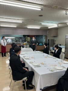 学寮食堂の給食業務を委託している株式会社魚国総本社京都支社から講師をお招きし、コース料理の基本的な作法について講習を受けました。