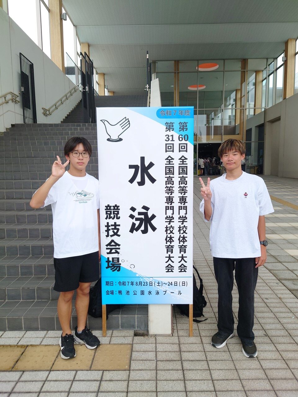 8月23日(土)・24日(日)に鴨池公園プール(鹿児島県)にて、第60回全国高等専門学校体育大会、第31回全国高等専門学校水泳競技大会が開催されました。出発前日に鹿児島県付近で台風が発生したため、現地入りや開催が危ぶまれましたが、無事に開催・出場することが出来ました。