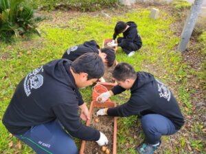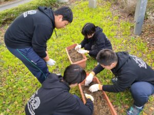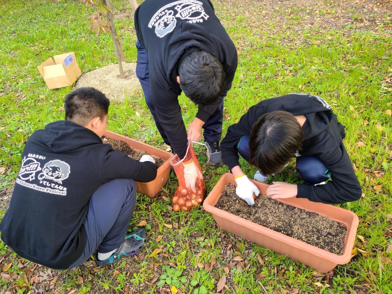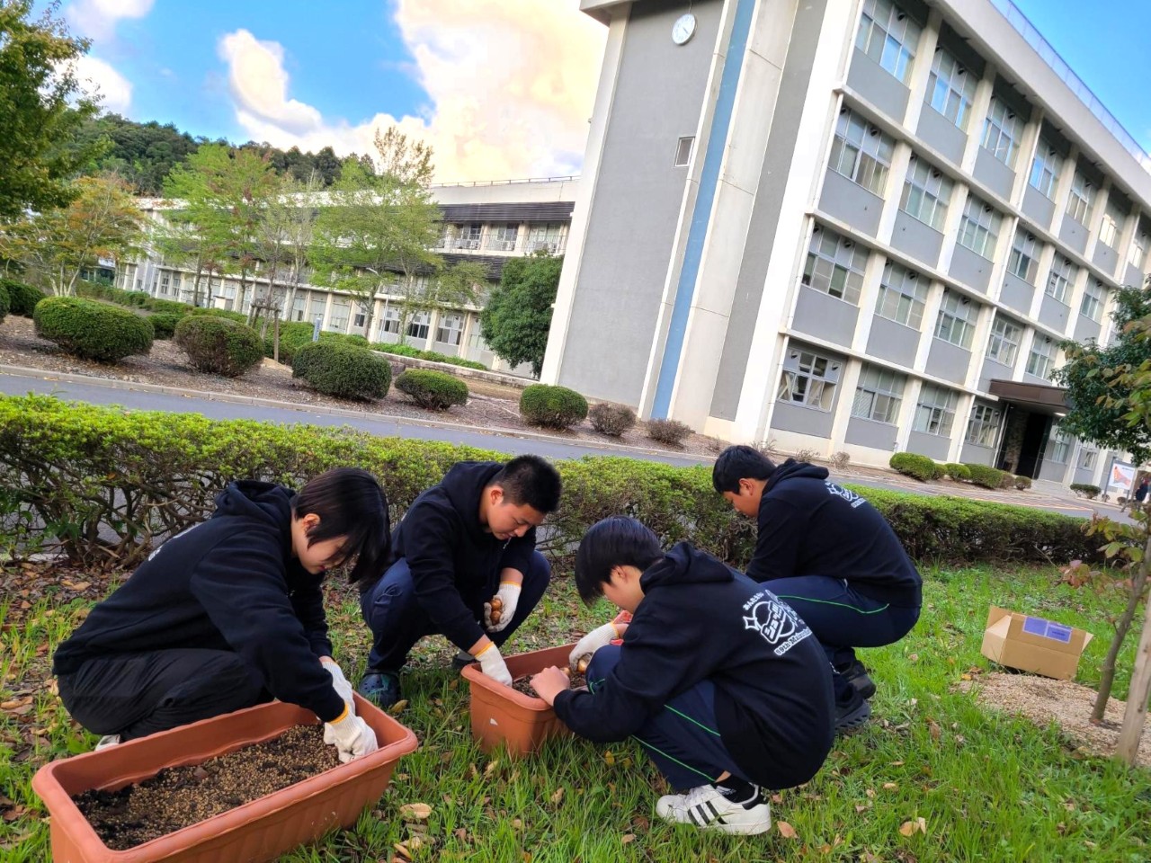 植栽作業には、11月1日・2日に開催される高専祭の本部メンバーが参加しました。当日は、そろいの高専祭パーカーを身にまとい、一つひとつ丁寧にスイセンの球根を植えてくれました。学生たちの笑顔と活気があふれる中、未来へつながる花の芽が土の中に託されました。