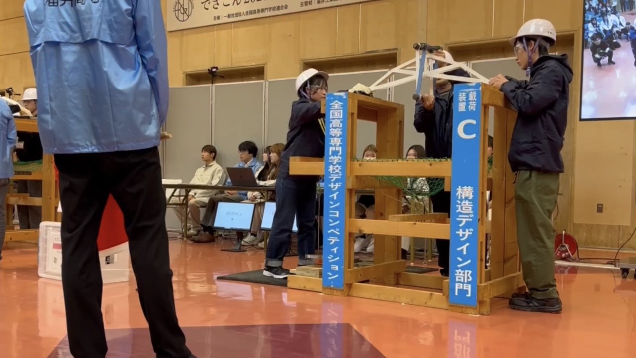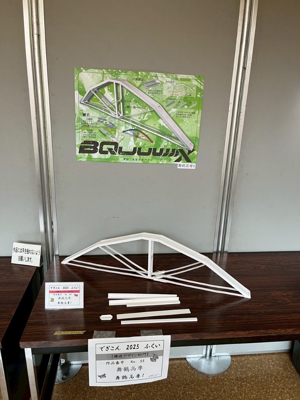 構造デザイン部門は、紙製の橋梁に最大60kgの荷重を載荷しても崩壊しないような設計が求められます。順位はより軽量な橋であることや審査員審査の点数を加えたもので、舞鶴高専の2チームは全体の5、6位という優秀な成績を収めたことで企業賞を受賞しました。