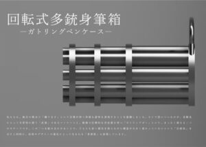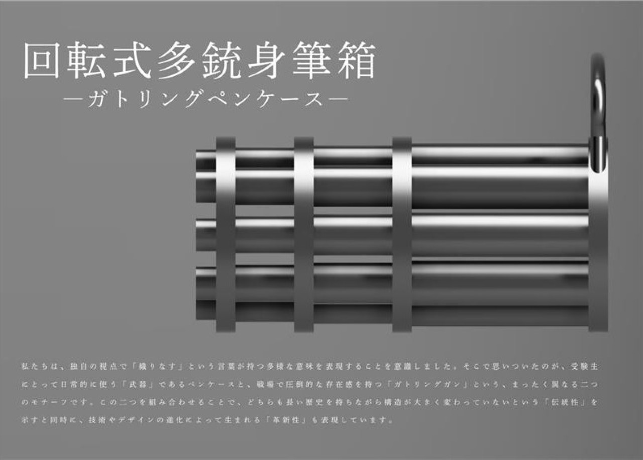 プレデザコン部門は、本科3年生までを対象とした部門で、AMデザインフィールドでは、3Dプリンターを用いて「織りなせ!アイデアとデザイン」をテーマとした作品を製作します。受賞作品の「回転式多銃身筆箱-ガトリングペンケース-」は、学生にとって日常的に使う「武器」であるペンケースと、戦場で圧倒的な存在感を持つ「ガトリングガン」を組み合わせた作品となっています。