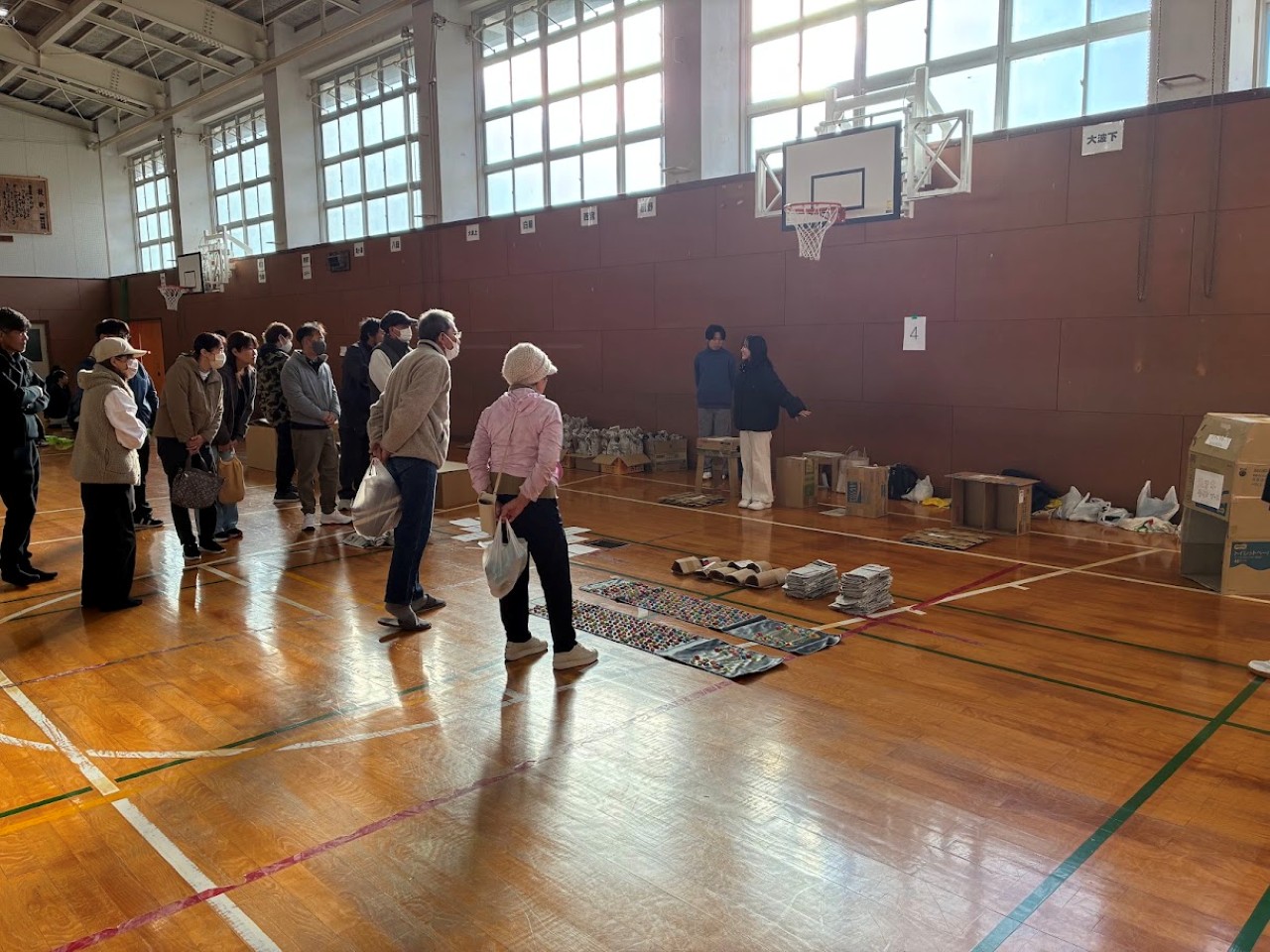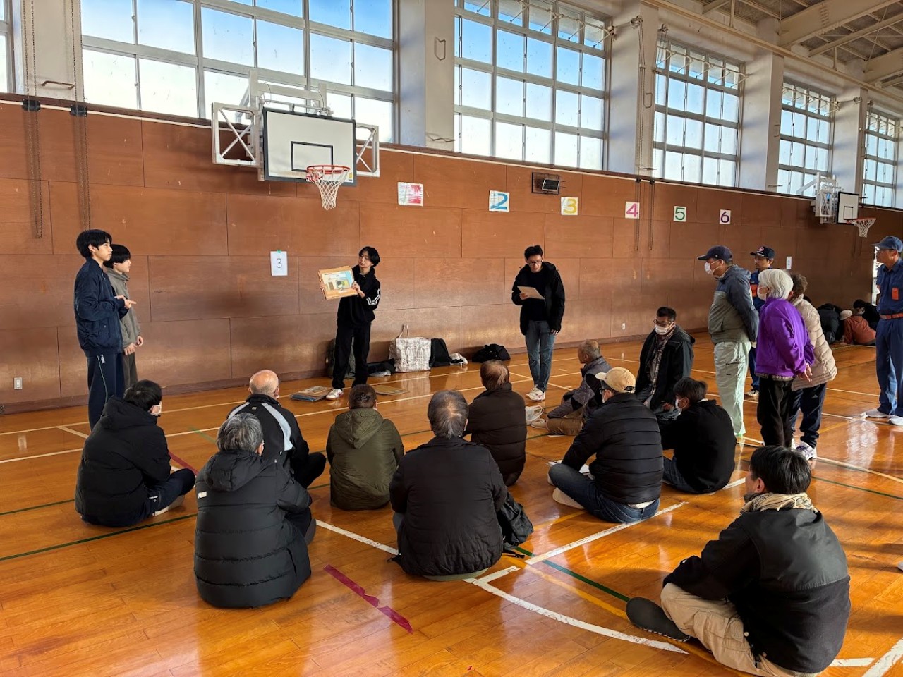 訓練には朝来地区の住民約80名の参加があり、学生たちの企画した「避難RPG」、「段ボールでつくる防災グッズ」、「防災カードゲーム」を実施し、防災について学んでいただきました。