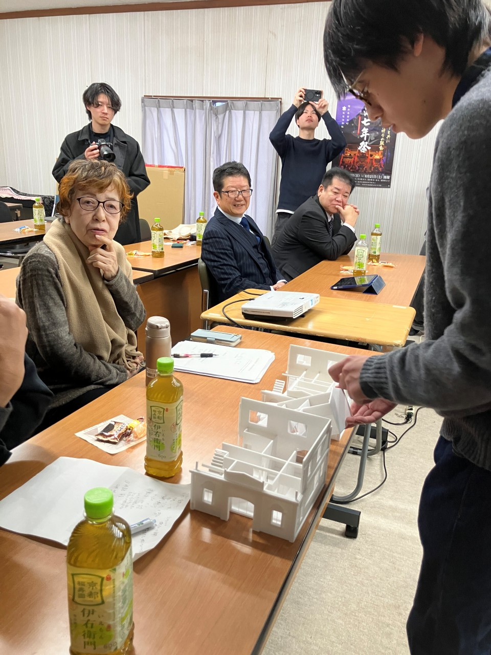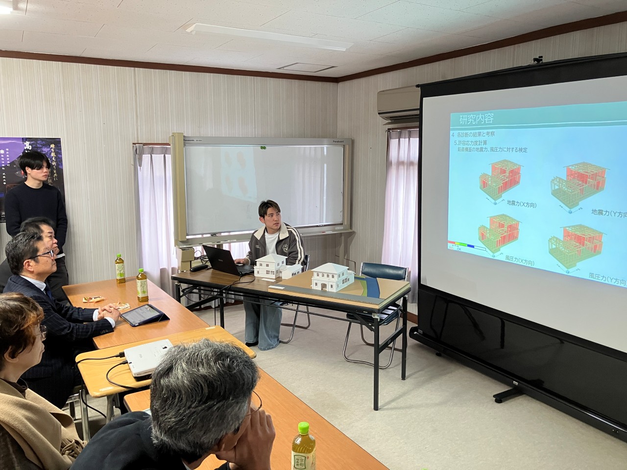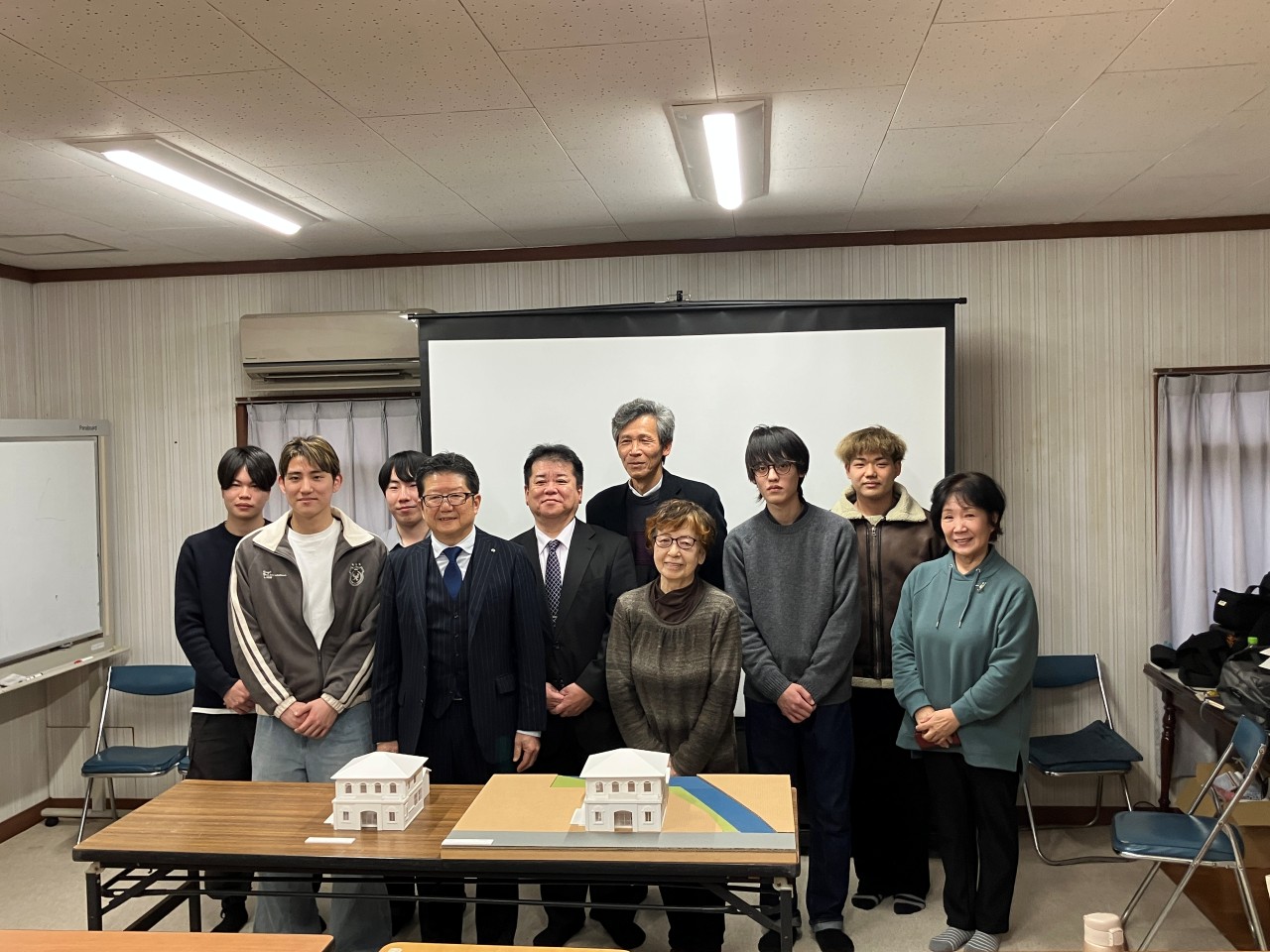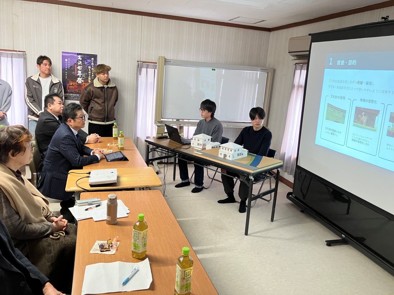 令和8年1月26日、高浜町からの受託研究「旧京都電灯改修」に関して、建設システム工学科尾上研究室と渡部研究室の学生が西嶋高浜町長、副町長、高浜町づくりネットワークの関係者等に研究内容の発表を行いました。