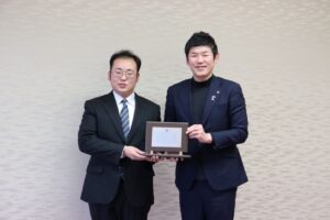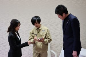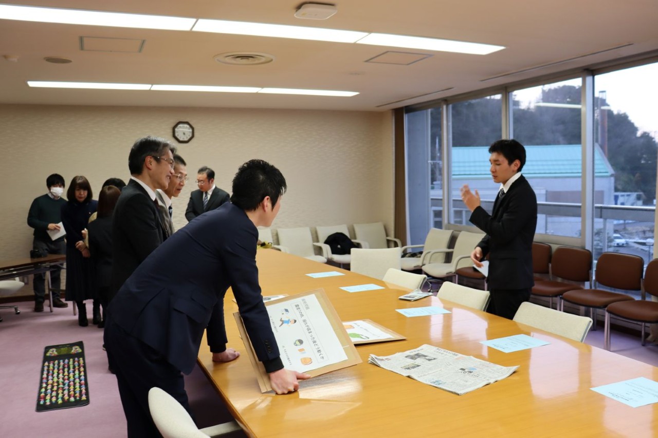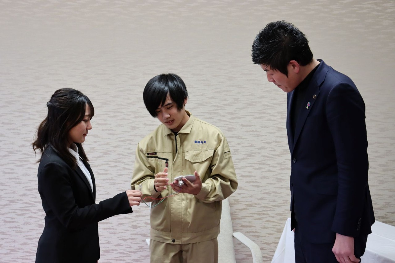 表彰式では、学生たちから鴨田市長に活動内容を紹介し、作成した防災グッズも実際に体験していただきました。市長からは、市民の防災意識向上に貢献する取り組みであると高く評価されました。