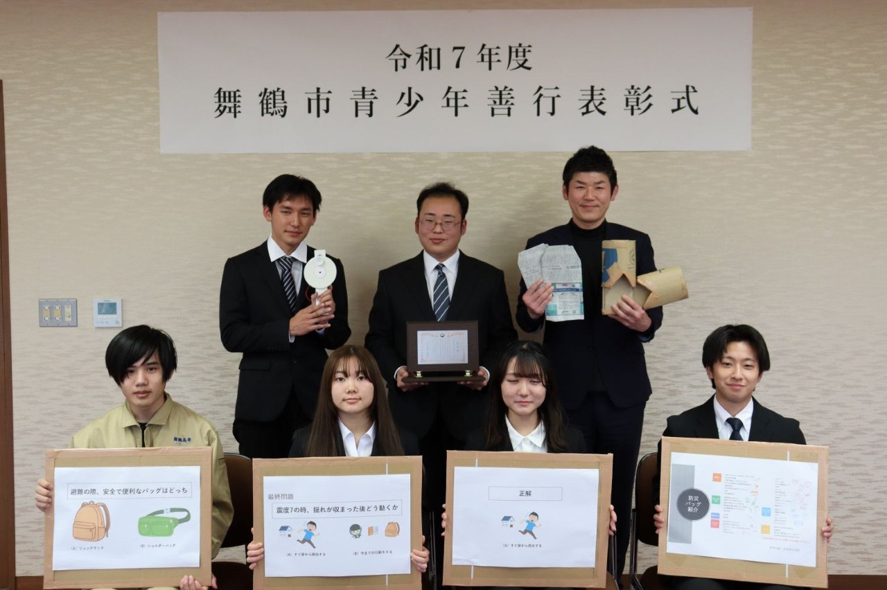 令和8年2月20日(金)に令和7年度舞鶴市青少年善行表彰式が行われ、防災活動を継続的に行っている本校の学生グループが表彰を受けました。
