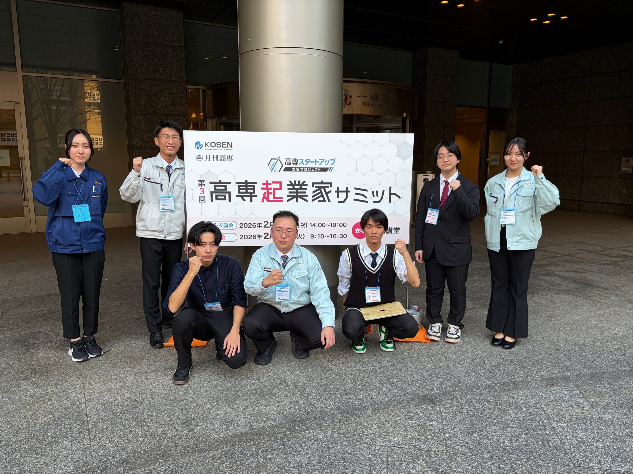 2026年2月23・24日、一橋講堂(東京)で開催されました第3回 高専起業家サミットにおいて、大橋祐亮さん(建設システム工学科3年)、土屋博貴さん(機械工学科3年)、福庭彩稀さん(建設システム工学科3年)、北村光瑠さん(電気情報工学科2年)、三好佑奈さん(電気情報工学科2年)のチーム「Crane Descends」がアイデア部門に、木寺達士さん(建設システム工学科3年)、川上直緒柔さん(建設システム工学科3年)のチーム「SchoolFarm」がスタートアップ部門に出場しました。