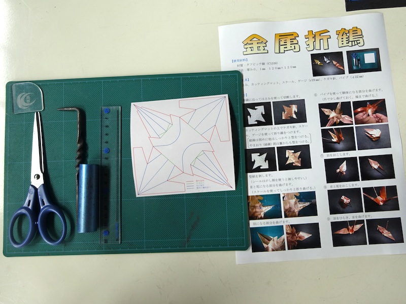 3日目の午前は、「ものづくり体験講座」がありました。折鶴のイラストの紙を貼り付けた0.1mmの銅板を切り取り線に沿ってはさみで切断、折り目をケガキ針でなぞってから紙をはがし、銅板を折って折鶴をつくるという内容でした。細かい作業ながらも実習工場の方々の丁寧な説明のもと、きれいな折り鶴に仕上げることができました。
