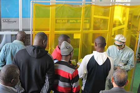 平成28年4月20日(水)、独立行政法人 国際協力機構(JICA)の本邦研修の一環で、コートジボワール産業・鉱業省局長らが本校実習工場などを見学されました。本支援センター職員が工場設備、特に炭酸ガスレーザ加工機の説明などの対応を行いました。レーザ加工機で作製した木製定規を手渡し、好評でした。
