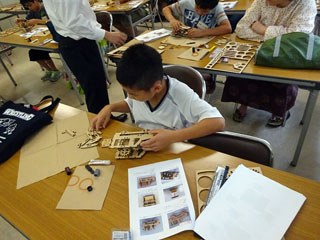 次に、ウッドクラフト本体の作製に移り、予めレーザ加工機で自作して用意しておいた組立キットから歯車部品を取り出し、竹ひごのシャフトに接着していきました。接着剤が乾くまでの間、舞鶴高専の紹介や歯車の動力伝達の役割について説明しました。その後、車体にシャフトやオリジナルデザインの看板を入れる作業となりました。歯車の接着位置やシャフトの取り付け順序などに少し手間取る面もありましたが、無事に完成させることができました。