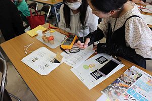今回は金属板にマグネシウムを加えており、レモンに差した途端に白い細かな泡が発生するのに驚いたり、野菜と金属板の組み合わせでデジタルテスターに表示される電圧が違って来る事に、参加した小中学生だけでなく付き添われた大人も興味津々でした。