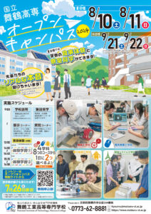 舞鶴高専では、中学生やその保護者の皆さんに、舞鶴高専のことをより深く知っていただく機会として、オープンキャンパスを実施しております。今年度は、夏日程:8月9日(土)・10日(日)、秋日程:9月13日(土)の3日間の開催予定となりますので、是非ご参加ください。