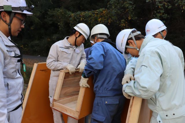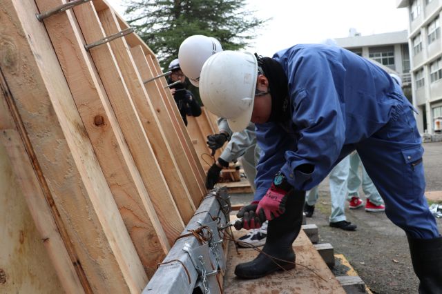 11月10日(土)、11日(日)に、行政機関と民間企業に所属する技術者、学生を対象に、e+iMec講習会【コンクリートの品質管理】を開催しました。今回の講習会は、京都府中丹東土木事務所、東海産商(株)、日本ミクニヤ(株)、舞鶴高専の学生計12名が受講しました。講習会は、計4日間にわたり行われます。今回は1日目、2日目のカリキュラムが実施され、座学の後、墨だし、鉄筋加工、型枠組立実習を行いました。受講者からは、手順の説明が分かりやすく細かい部分まで教えていただけた、貴重な経験ができた、図面を見て実際に配筋を行うことができた等の感想がありました。次回は11月20日にコンクリート打設を行います。