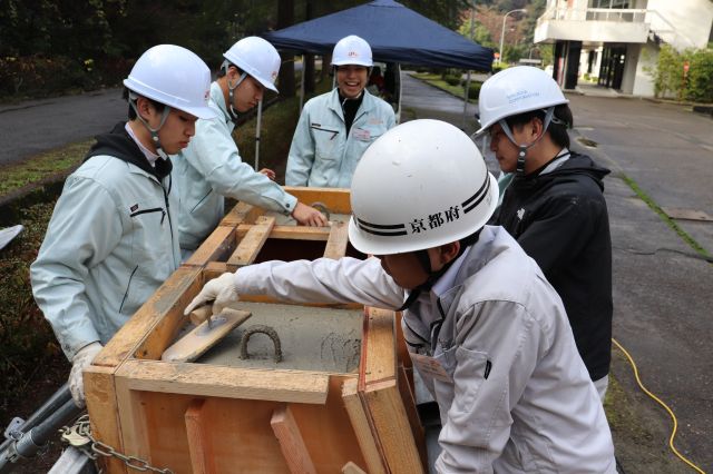 11月20日(火)に、行政機関と民間企業に所属する技術者、学生を対象に、e+iMec講習会【コンクリートの品質管理】を開催しました。今回の講習会は、京都府中丹東土木事務所、東海産商(株)、日本ミクニヤ(株)、舞鶴高専の学生計12名が受講しました。講習会は、計4日間にわたり行われます。今回は3日目のカリキュラムが実施され、座学の後、生コン受入れ検査、打設、コテ仕上げ・養生実習を行いました。受講者からは、実際の工事での手順を見れて勉強になりました、職人さんから指導してもらえて色々な技術を学べて良かった等の感想がありました。次回は11月25日にコンクリート脱型を行います。