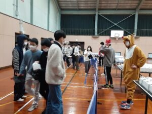 じゃんけん列車では体育館全体を使いながら100人近い列が出来上がり、鶴友寮で生活している寮生の規模を実感しました。ドッチボールは学科対抗で行われ、優勝を目指して白熱した対戦が繰り広げられました。高学年の寮生もそれぞれの学科チームに加わり、後輩たちに頼りになる姿を見せてくれました。ビンゴ大会ではカップ麺や小型家電、健康グッズや化粧品など、先輩寮生たちが選んだ寮生活を豊かにするアイテムが景品としてならび、たくさんの寮生にいきわたりました。