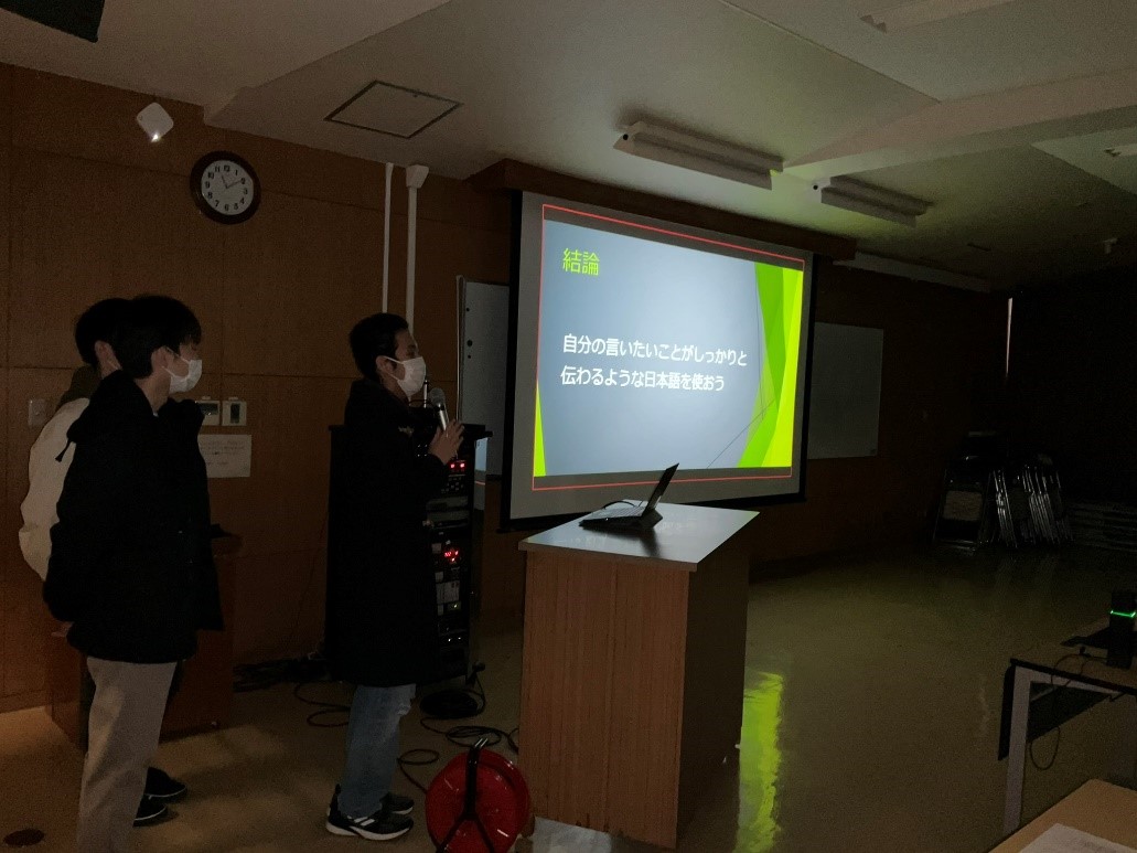 期末試験の終了翌日の2月10日には、各クラスから2グループずつ投票で選ばれた計8グループが、エキシビションとして1年生全員の前で再度発表を披露しました。オンラインでは、数名の教員も視聴していました。