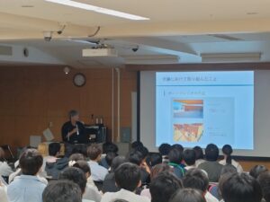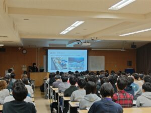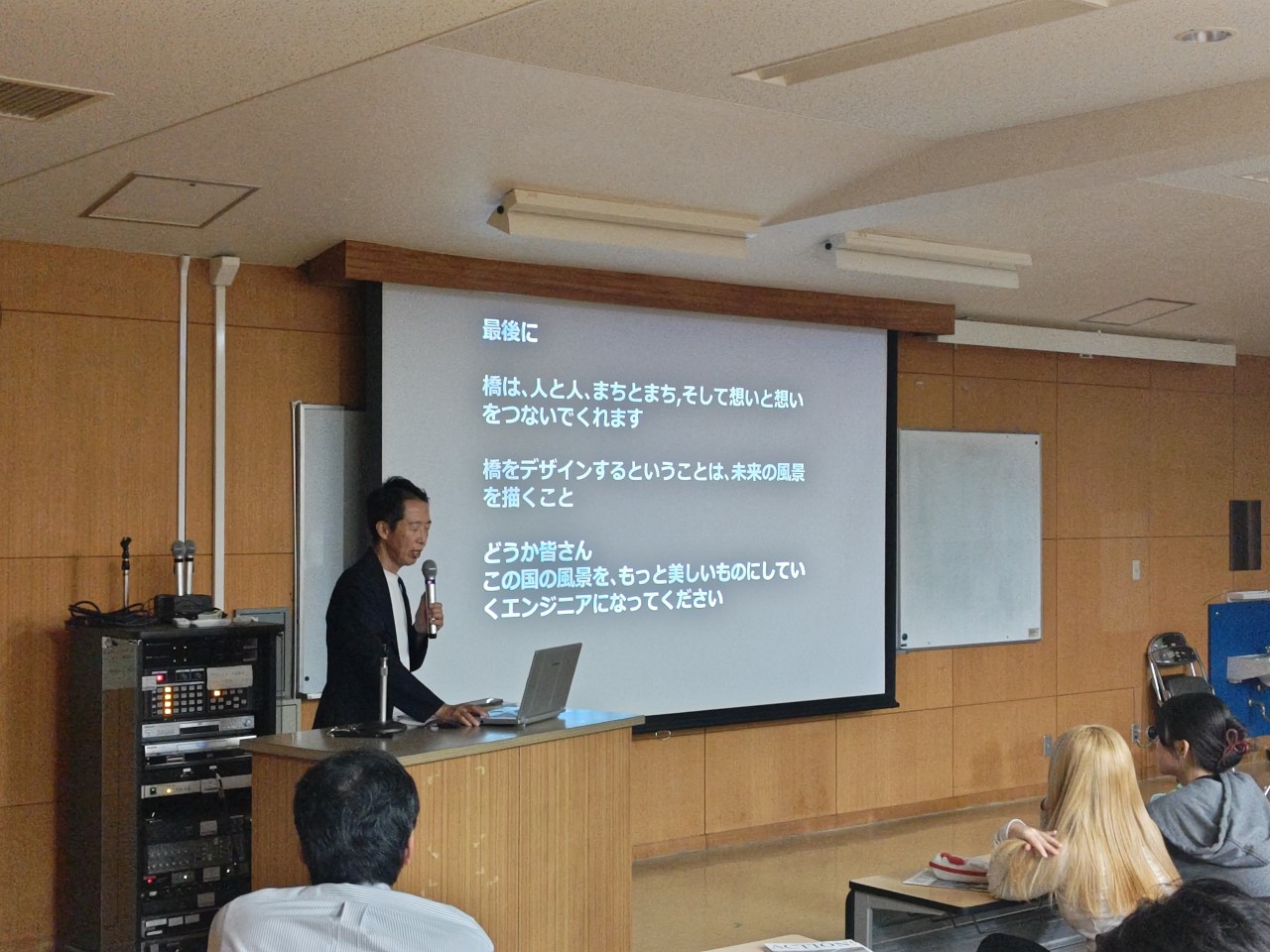 講演では、舞鶴高専での学生時代の思い出から、橋梁エンジニアとしてのキャリア、そしてテレビ出演を通じた裏話まで、多彩なエピソードを交えながらお話いただきました。終盤には、「橋は、人と人、まちとまち、そして想いと想いをつないでくれます。橋をデザインするということは、未来の風景を描くこと。どうか皆さん、この国の風景をもっと美しいものにしていくエンジニアになってください」という熱いメッセージで締めくくられ、学生たちも心を動かされていました 。