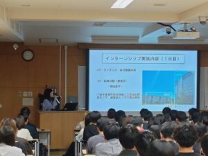 第1部では、4年生のインターンシップ報告、5年生の就職・進学報告を都市環境・建築の各コース1名ずつから発表していただきました。