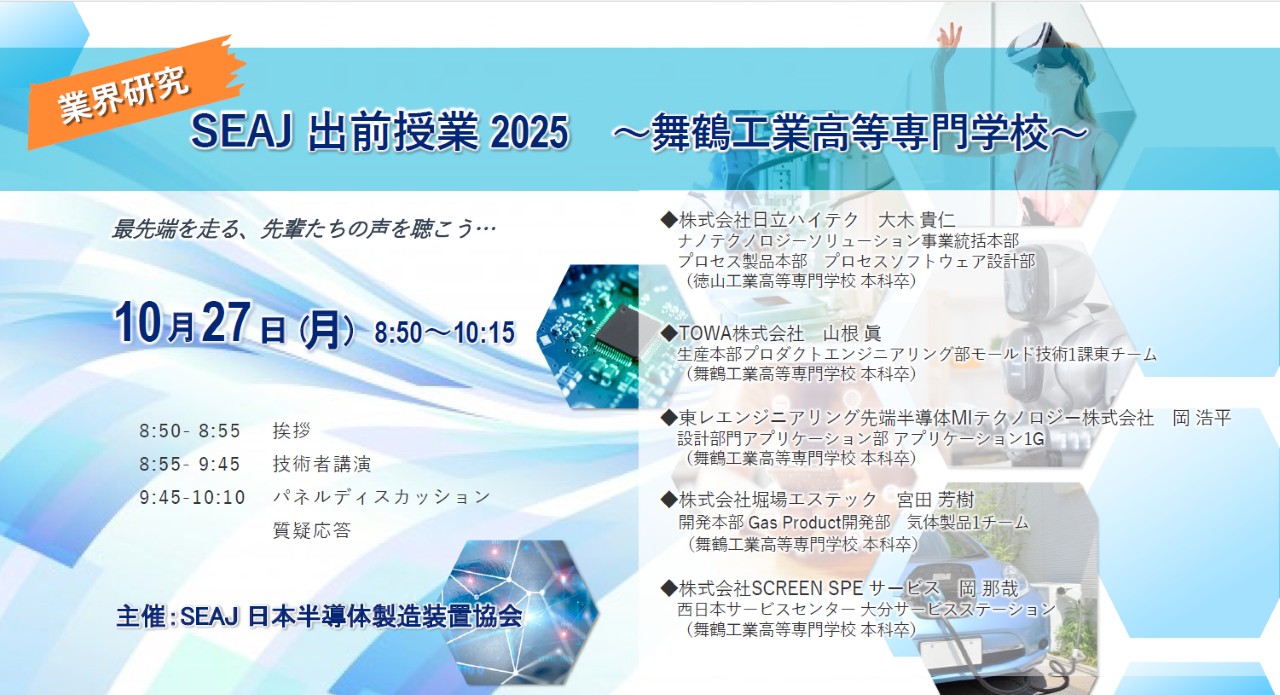 COMPASS 5.0 半導体分野 実践校の取り組みの一つとして、令和7年10月27日(月)に日本半導体製造装置協会(SEAJ)主催の出前授業を電子制御工学科2年生が受講しました。